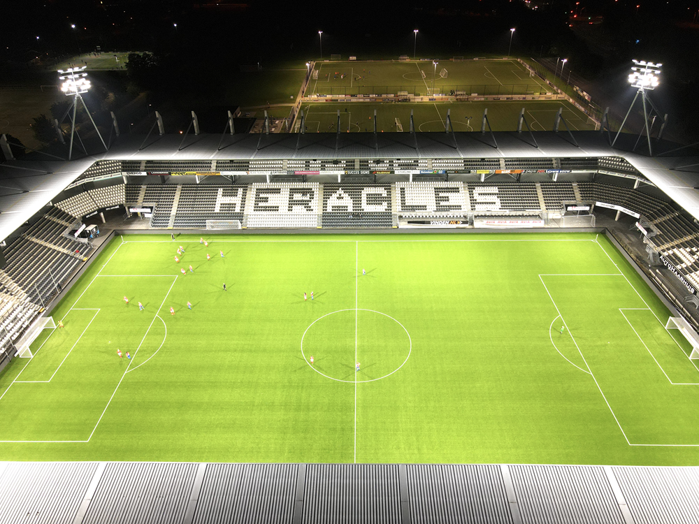 This was the key question posed by the board of directors of Heracles Almelo, a Dutch club in the Eredivisie, the top tier of football in the Netherlands. Furthermore, could lighting play a role in the club’s expanded fan entertainment program? Reducing light emissions towards surrounding homes was also on their wish list. And of course, avoiding overloading the stress capacity was a critical factor. A comprehensive set of requirements was presented to us. This is the story of how we took on the challenge.